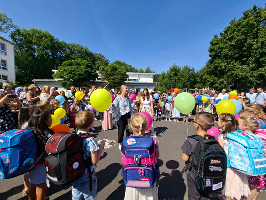 Im Anschluss gingen die Erstklässler in ihre Klassenräume und hatten ihre erste Unterrichtsstunde. Danach folgte in der Sporthalle die Übergabe der Zuckertüten – ein Höhepunkt für die Kinder und ihre Familien. Zum Abschluss ließen die Erstklässler bunte Luftballons mit ihren persönlichen Wünschen in den Himmel steigen. Unter strahlendem Sonnenschein und blauem Himmel bot sich ein farbenfrohes Bild, das für eine hoffnungsvolle und fröhliche Grundschulzeit steht.