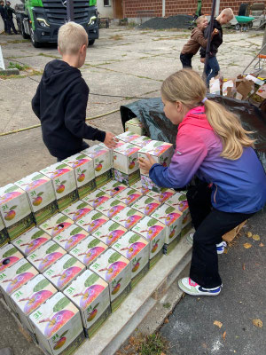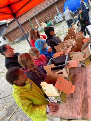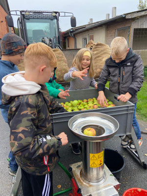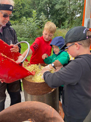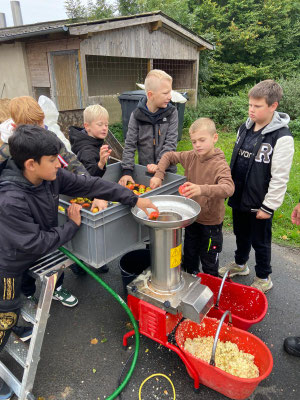 Zuerst hieß es: Äpfel sammeln, waschen, häckseln und kräftig pressen. Aus den Äpfeln floss der Saft in Strömen – und der Duft von frischem Apfel lag überall in der Luft. Danach wurde gefiltert, pasteurisiert, in Kartons abgefüllt, gefaltet und gestapelt. Fast wie in einer kleinen Apfelsaftfabrik – nur eben mit ganz vielen Kinderhänden.
