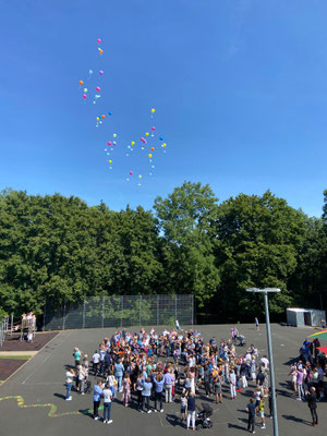 Nach dem Gottesdienst versammelten sich alle auf dem Schulhof, wo die Viertklässler symbolisch ihre Zukunftswünsche auf farbenfrohen Luftballons in den Himmel steigen ließen – ein wunderschöner Abschluss ihrer Grundschulzeit.
