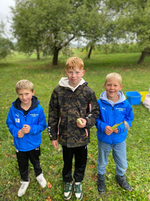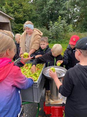 Die Kinder der Klassen 3a und 3b machten sich mit ihren Lehrkräften Herrn Stumpf und Frau Henning auf den Weg nach Soisdorf – genauer gesagt auf den Bauernhof von Herrn Stumpfs Eltern. Dort wartete ein echtes Apfelsaft-Abenteuer!