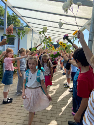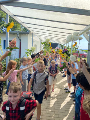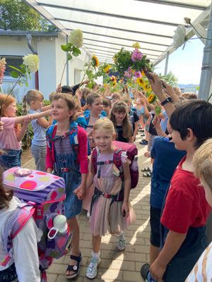 Die Feier begann um 9:30 Uhr mit einem Gottesdienst in der Kirche, gestaltet von Pfarrer Krüger und Pfarrerin Becker. Auf dem Weg zurück zur Schule erwartete die neuen Erstklässler eine besondere Begrüßung: Die Kinder der Klassen 2, 3 und 4 standen Spalier, hielten bunte Blumen in den Händen und nahmen die Jüngsten herzlich in die Schulgemeinschaft auf.